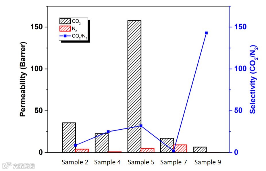 图4. 部分E-PILs样品的气体分离测试数据,黑色柱状图代表二氧化碳透过率, 红色柱状图代表氮气透过率,蓝色数值为以上二者比值。