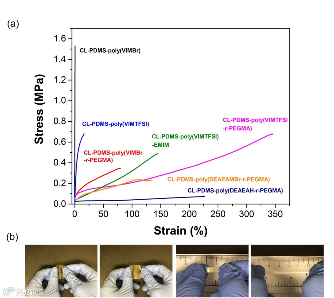 图2. (a)E-PIL的应力应变曲线,(b)E-PIL的拉伸演示图片。