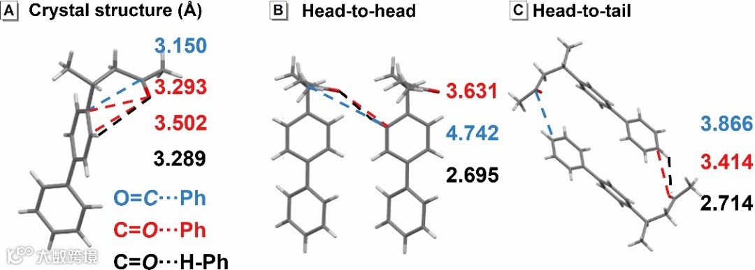 为了获得更直接的证据,作者培养了小分子模型的单晶结构。单晶结构分析进一步显示,除了预期的O=C···Ph,C=O···Ph等相互作用外,还存在C=O···H-Ph氢键。该共聚物的非典型发光正是由以上分子间作用形成的空间电子传输导致,而氢键能促进簇集的形成,并能进一步促进这些作用的形成,从而有利于发光。此外,单晶堆积结构还显示,聚合物链间羰基和苯环的相互作用,以头-尾的方式为主。