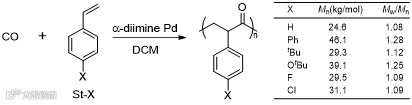 在前期研究中,中山大学高海洋教授课题组采用大位阻骨架的策略,合理的解决了α-二亚胺钯催化苯乙烯和CO聚合中上述的难题。作者设计合成的大位阻二苯并桶烯骨架的α-二亚胺钯催化体系,实现了催化苯乙烯与CO活性交替共聚合(Macromolecules 2018, 51, 9110-9121)。由于后过渡的钯金属对极性单体显示出了良好的容忍性,在前期研究的基础上,高海洋教授课题组继续采用二苯并桶烯骨架的α-二亚胺钯催化体系,催化对位含有不同取代基的苯乙烯单体(St-X, X = H, Ph, tBu, OtBu, F, Cl)。