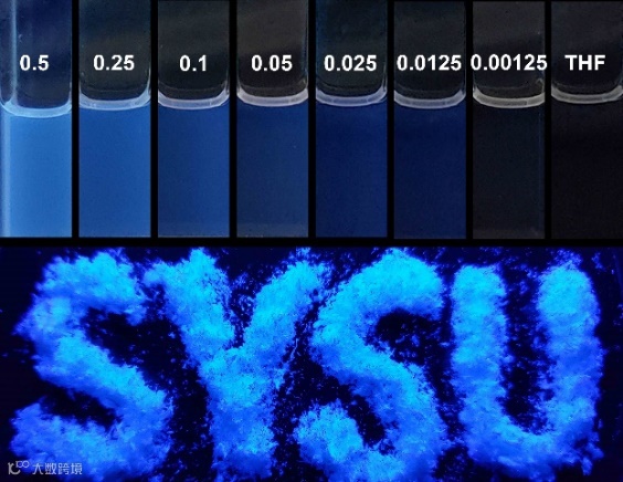 在365nm紫外光照下,芳香族聚酮固体粉末及其四氢呋喃溶液均可产生蓝色荧光。以最简单的苯乙烯/一氧化碳交替共聚物为例,其稀溶液不发光(<1.25 × 10-3 M),而其浓溶液和固体发光,最大发射波长为429nm,并表现出浓度增强发光,紫外可见光谱和动态光散射结果证实,随浓度上升,有聚集体的形成。除此之外,芳香族聚酮溶液和固体的荧光性能还受激发波长的影响,这些结果暗示着芳香族聚酮发光遵循簇集发光机理(Clusterization-Triggered Emission,CTE)。