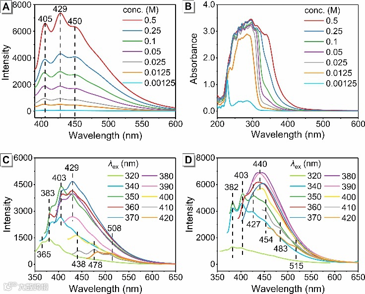 图3. 不同浓度的芳香族聚酮溶液的荧光光谱(A)和紫外-可见吸收光谱(B);不同激发波长下芳香族聚酮溶液(C)和固体的荧光光谱(D)。