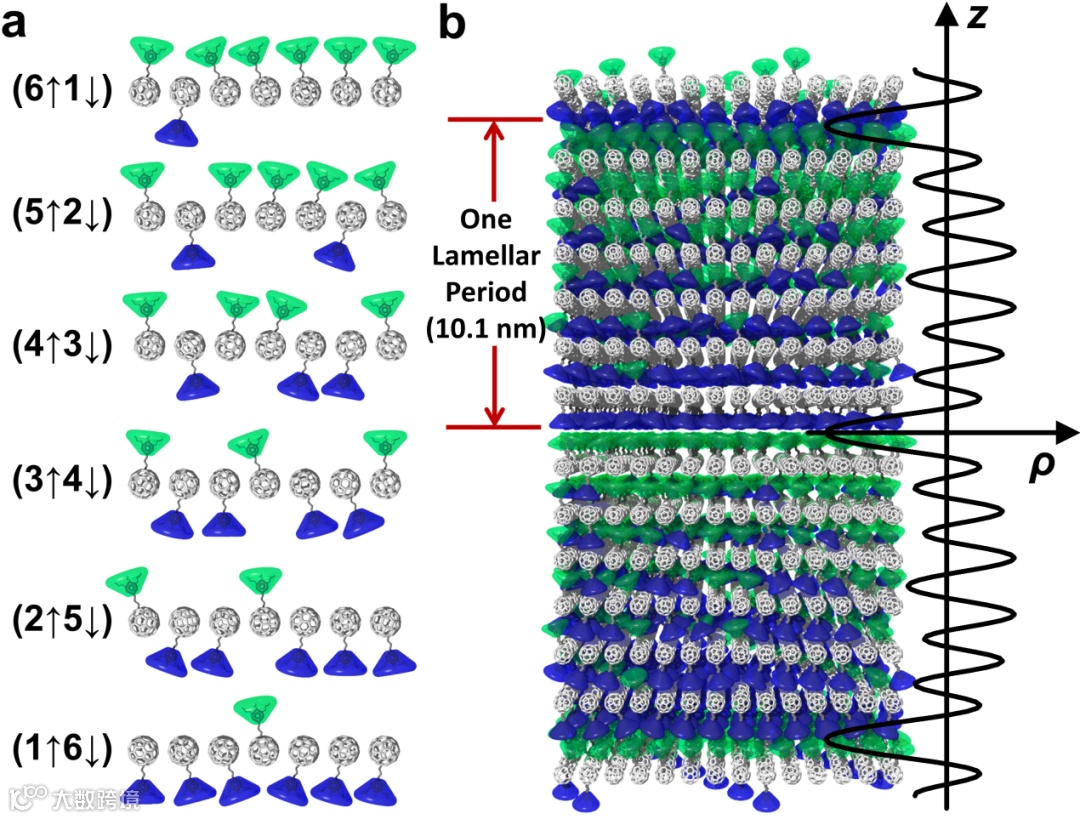 计算结果表明,7个球形富勒烯C60所占据的截面积与6个柔性锥相当。以一维方向的排列为例,在第一个亚层中,若有6个富勒烯嵌段分子按照柔性锥朝下的方向排列,为了保证合理的空间填充,则第7个分子必须朝上排列(1↑6↓,图4a)。在第二个亚层中,所剩空间只够让5个分子朝下排列,有2个分子需要朝上(2↑5↓)。以此类推,在六个亚层后,富勒烯上方的面积完全被朝上的柔性锥占据。此时开始一个新的周期,下一个亚层的分子重新以(1↑6↓)的方式开始排列(图4b左)。此外,作者利用小角X射线各个散射峰强度对垂直于层方向的自组装结构进行了电子密度重构,其结果与所推测的模型相符(图4b右)。