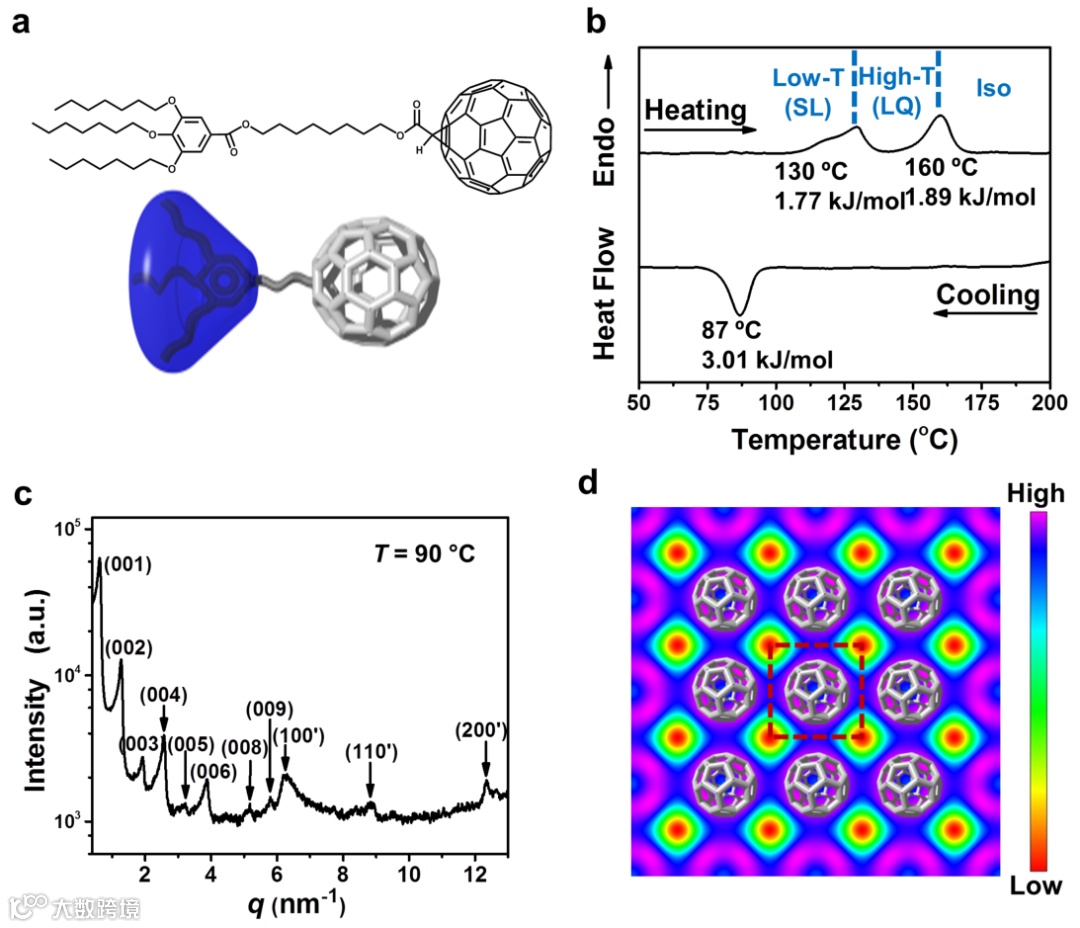 图2. 富勒烯液晶嵌段分子C7-C8-C60的化学结构及相行为。(a)分子结构及模型;(b)DSC升降温曲线;(c)90 °C时的SAXS曲线;(d)层内电子密度重构图。