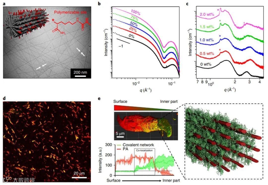 对于纳米纤维,冷冻透射电子显微镜(Cryo-TEM)显示了直径约为8-10nm、长度为数十微米的轮廓分明的圆柱形纳米纤维,小角X射线散射(SAXS)显示了高长径比纤维的形成。圆二色谱(CD)分析表明,共组装纳米结构中存在β-片状二级结构。再对聚合物网络进行表征,通过广角X射线散射(WAXS)、共聚焦显微镜等实验表明,共价聚合物网络和整个材料中都存在超分子纳米纤维,并且成束的纤维与网络同域。