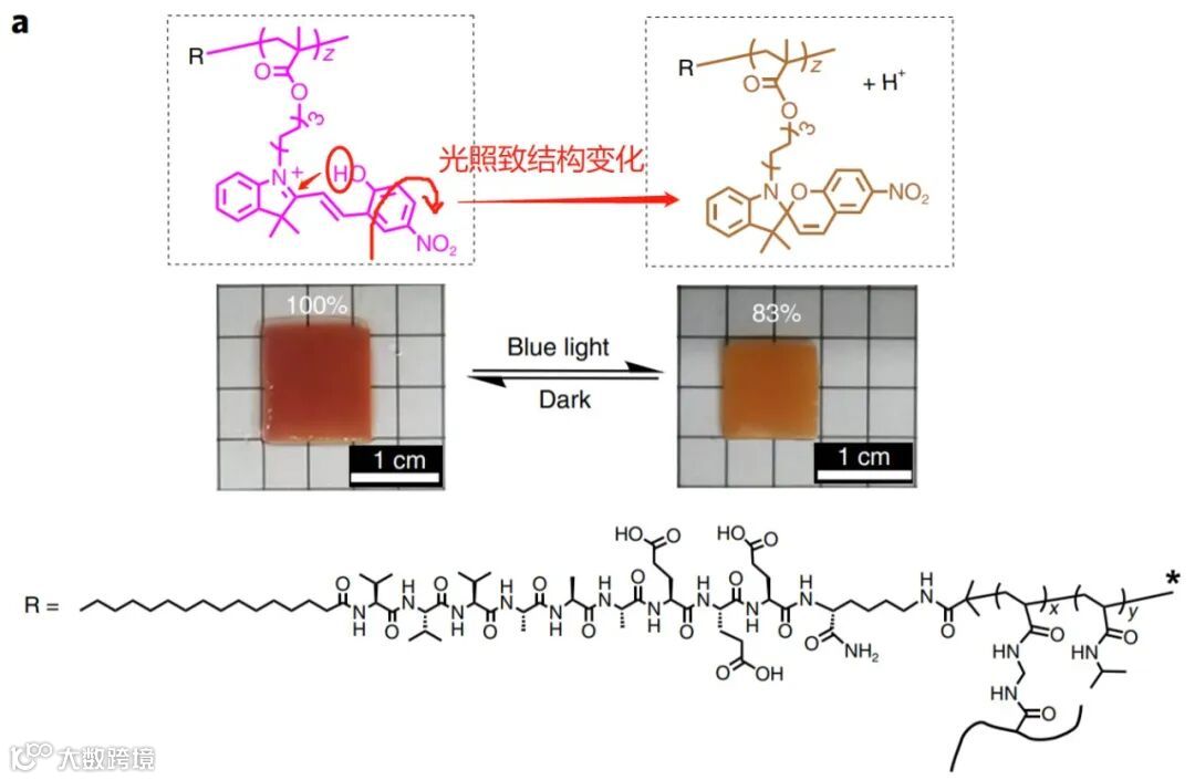 在流变学测量实验中表明,超分子和共价网络组分之间的化学键合是机械增强的关键因素,且超分子-共价杂物相对于全共价聚合物水凝胶具有更高的韧性。在光异构化反应的实验中发现杂化水凝胶的薄片在可见光照射下收缩至原始体积的83%,这是由于质子化的花青形式(MCH+)异构化为螺并吡喃形式(SP),且PA杂化物的收缩速度比共价网络的收缩速度快。