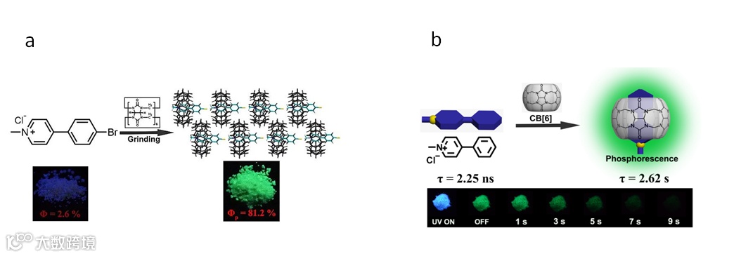 针对这一问题,南开大学刘育教授课题组发现有机小分子溴苯基甲基吡啶PYX(X= Cl, Br, I, PF6)的抗衡离子不同,发光效率也不同(从0.4%到24.1%),同时,他们选取了葫芦[6]脲(Cucurbit[6]uril)作为主体,利用固相合成法与PYX键合,所得复合物的磷光得到了极大地增强,达到了81.2%。随后,他们通过避重就轻的策略用4-苯基-1-甲基吡啶-1-氯铵替代4-(4-溴苯基)-1-甲基吡啶-1-氯铵可显著提高其磷光寿命(至2.62 s)。
