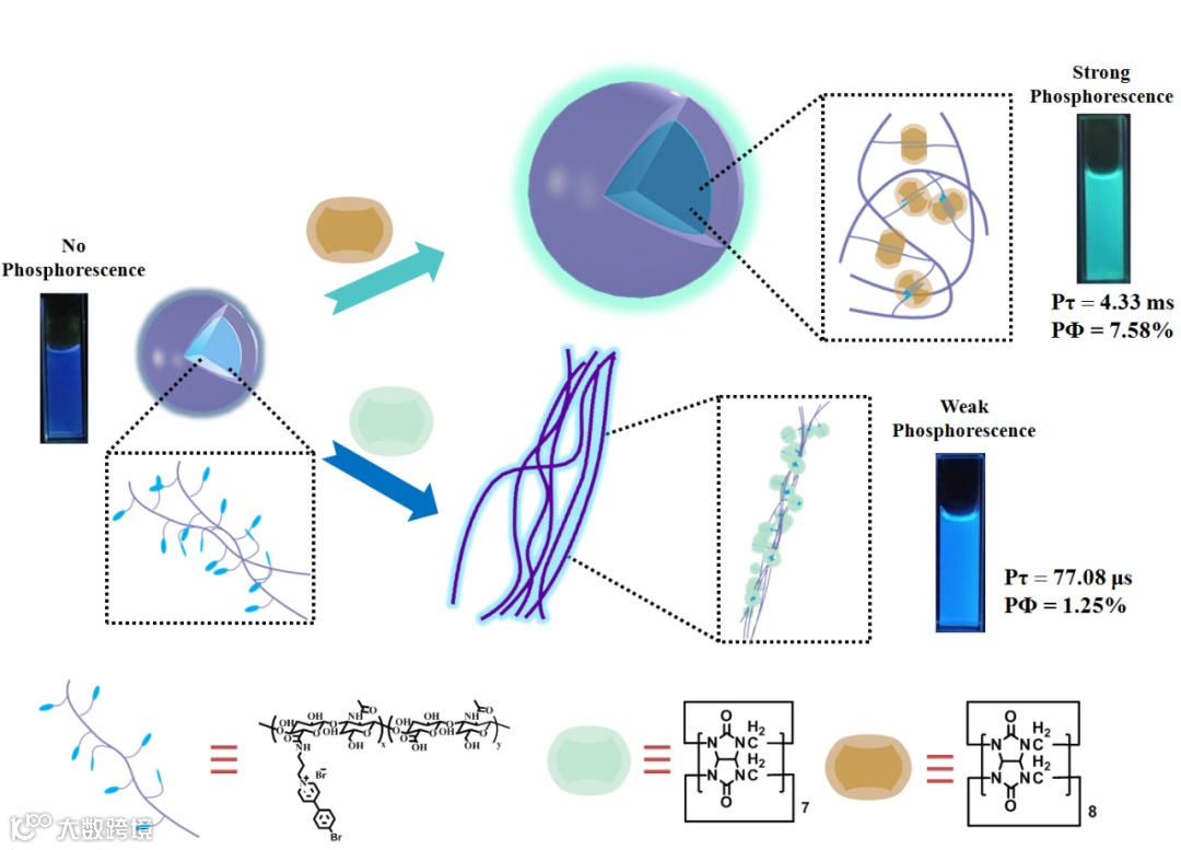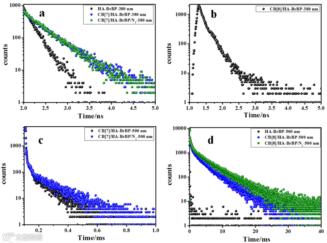 在前期工作基础上,由南开大学刘育教授带领的研究团队将磷光基团4-(4-溴苯基)吡啶-1-盐(BrBP)修饰在具有肿瘤靶向的透明质酸(HA)高分子链上。发现在水中向HA–BrBP中添加CB [7]或CB [8]形成假轮烷聚合物时,其形貌由小球分别变为线性和大球型组装体,同时在其发光光谱500nm处均出现新的发射峰,尤其与CB [8]形成的组装体在500 nm处的发射强度大约是在380 nm附近的发射强度的2倍。时间分辨(延迟0.2 ms)的光致发光光谱还显示出CB [8] /HA-BrBP在500 nm处的强烈磷光发射,而CB [8] / HA-BrBP的磷光更强比CB [7] / HA-BrBP。时间分辨衰减数据的分析显示,CB [8] / HA-BrBP在500 nm处的磷光寿命超长,为4.33 ms(量子产率7.58%)。结果表明,使用CB [8] / HA-BrBP假轮烷聚合物可以实现水溶液中的高效RTP。据所知,迄今为止,该聚合物相比于在水溶液中的任何纯有机物质都具有相对较长的RTP寿命。