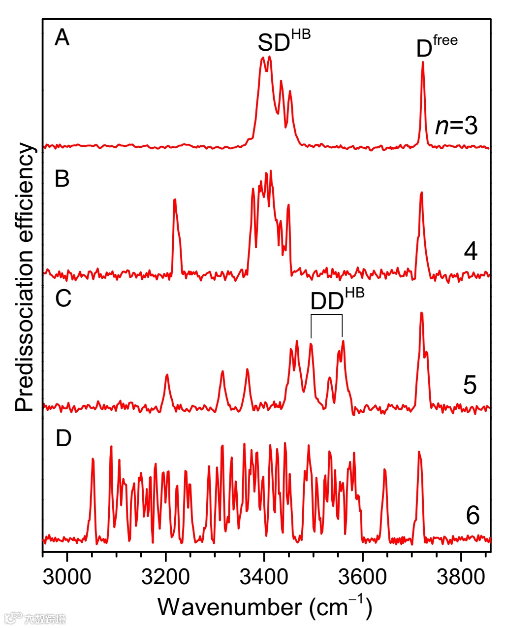 我们来看看上图, 图B、C、D是三种不同的五个水分子团簇结构的理论光谱,其中B代表二维结构,C、D代表三维结构,可以看到,三维结构的理论光谱是有DDHB特征吸收峰的,而二维结构则没有DDHB。图A是五个水分子团簇的实验红外光谱,可以看到明显的DDHB特征吸收峰。