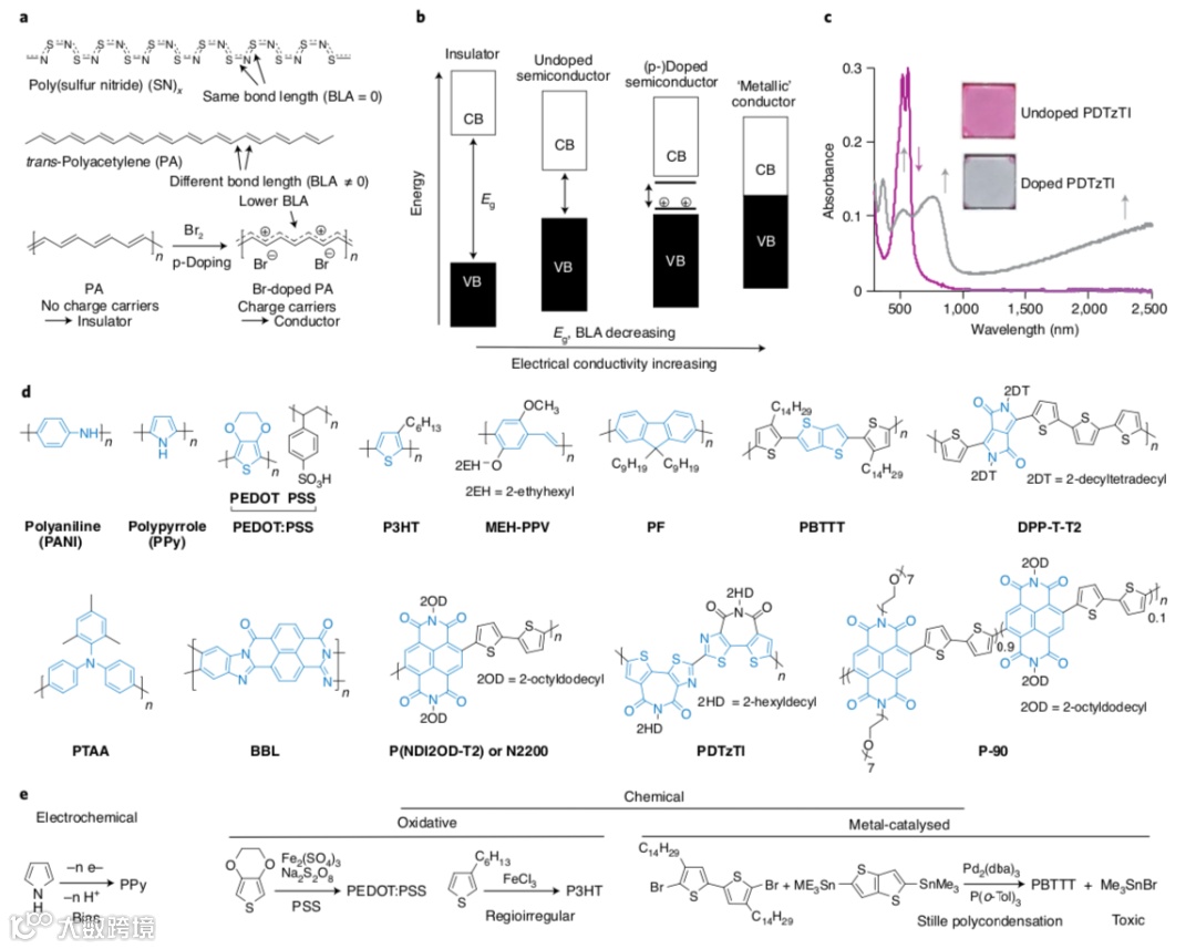 图 2. 导电聚合物的掺杂、化学结构和合成.