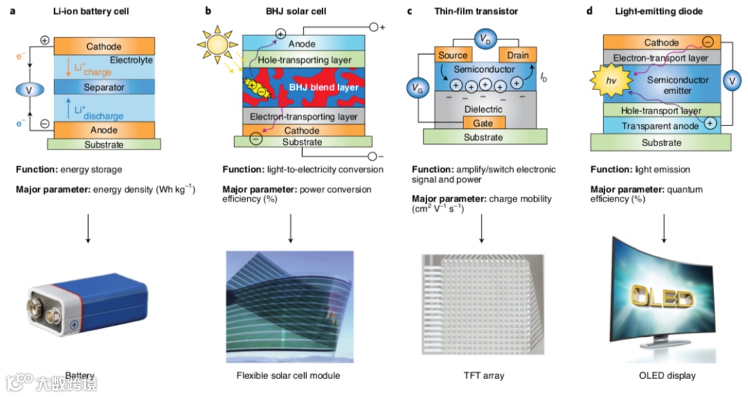 CP更大商业市场的应用包括用于光伏模块的有机太阳能电池,用于显示器和逻辑电路的有机薄膜晶体管以及用于显示器和照明的有机发光二极管(图2所示)。此外,CP可作为新兴钙钛矿太阳能电池中的空穴和电子传输层,尽管取得了很高的能量转化效率,然而,这项年轻技术的商业前景仍有待确定。