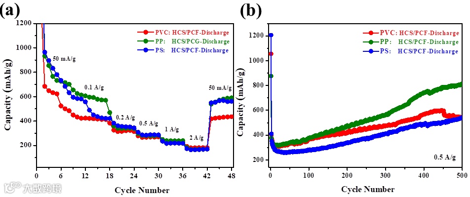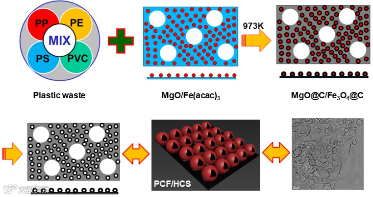在最近的工作中(Chemical Communications, 2020, ASAP, doi.org/10.1039/D0CC03236K),该团队与合作者探索了“活性模板碳化”策略在合成中空碳球(HCS)/多孔碳薄片(PCF)三维碳纳米材料中的应用。该方法以“多孔氧化镁/乙酰丙酮铁MgO/(Fe(acac)3”为组合碳化模板,并分别以聚丙烯(PP)、聚乙烯(PE)、聚苯乙烯(PS)、聚氯乙烯(PVC)废弃物以及它们的混合物为碳源,制备了一系列内置Fe3O4纳米粒子活性物质的三维中空多孔碳纳米材料(HCS/PCF),并将其应用到锂离子电池负极材料当中(图1)。根据聚合物碳源的种类,依次将电极命名为PP:HCS/PCF, PE:HCS/PCF, PS:HCS/PCF, PVC:HCS/PCF.