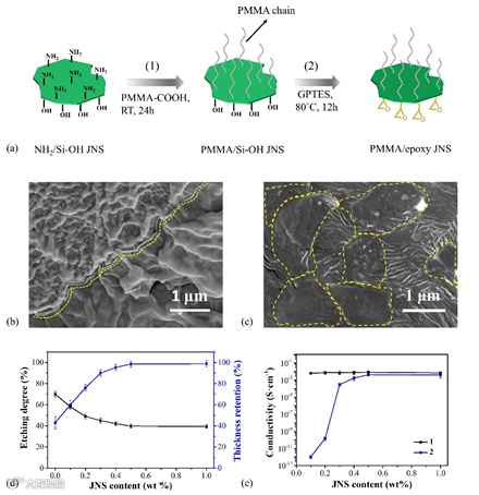 图1.(a)功能性Janus纳米片合成;(b)PVDF/PLLA/JNS(60/40/0.5)共混物断面;(c)氯仿刻蚀后,PVDF骨架表面;(d)氯仿刻蚀后,高分子共混物刻蚀率(黑)和厚度(蓝)随Janus纳米片含量变化曲线;(e)高温热压前(1)和热压后(2),PVDF膜导电性随Janus纳米片含量变化曲线。