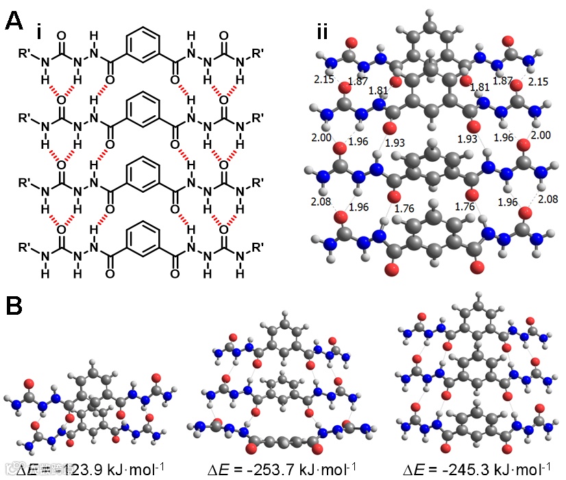 图3.(A)ASC模型化合物(R'= H)氢键四聚体示意图(i)和量子化学(B97D/6-311G++(2d,2p))优化结构(ii)。(B)不同氢键聚集体及其稳定能(∆E)。