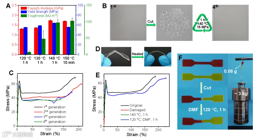 图4. PASC材料的重加工和修复性能。(A)不同温度下热压1 h后的机械性能数据;多次重加工的光学照片(B)和拉伸曲线(C);材料修复前后的照片(D)和拉伸曲线(E);(F) 修复材料提重物照片。