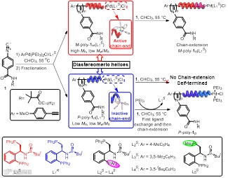通过仔细研究配体对聚合反应螺旋选择性的影响,作者还探索了聚合反应机理。如图1所示:当Pd(II)/L1S引发单体1聚合时,在聚合反应初期会同时生成左、右手螺旋聚合物,其中右手螺旋聚合物为主要产物。随着链增长反应,右手螺旋聚合物逐渐自终止,而左手螺旋聚合物仍然能保持较高的聚合活性,能够继续引发单体聚合直至单体完全转化。基于这一有趣的实验现象,作者提出了自终止机理,即:在聚合反应初期,聚合物链末端- Pd(II) /L1S的活性主要受手性配体L1S位阻的影响,生成右手螺旋聚合物为主产物;但是左、右手螺旋聚合物均具有活性,都能够引发单体发生链增长反应。但是当聚合物链增长到足以形成稳定螺旋结构时,聚合物链末端- Pd(II) /L1S的活性则同时受到配体位阻和聚合物主链螺旋方向的影响,右手旋螺旋聚合物的末端钯配合物P-helix-Pd(II)/L1S结构较拥挤,抑制了单体插入和链增长,出现自终止现象;而左手螺旋聚合物末端的末端钯配合物M-helix-Pd(II)/L1S结构较为松散,有利于单体的插入和链增长(图1),因此可以保持活性并发生链增长反应。此外,作者还通过配体交换反应和调控配体的位阻等方法进一步确证了该聚合反应的机理。