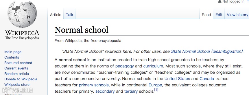 维基百科的词条“Normal School”上面写道:Normal School,指的是通过讲授教学方法和相关课程来培养老师的一种院校。大多数这样的学校仍然存在,但都改称“teacher-training colleges”或“teachers' colleges”了。