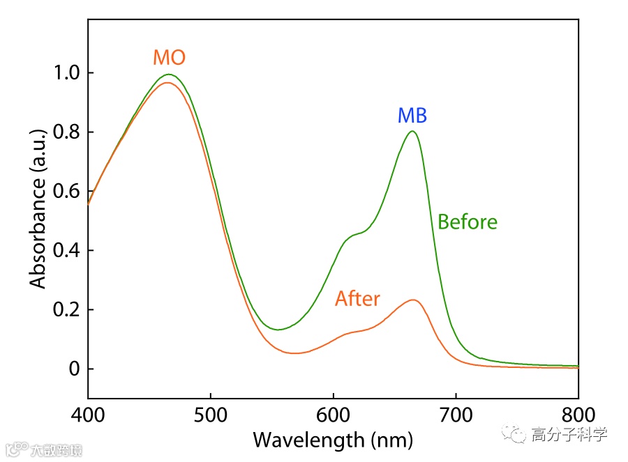 图4. 纳米多孔聚合物对MB与MO混合溶液吸附前后的UV-Vis图