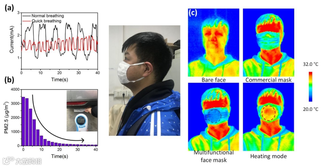 将此多功能电子织物应用于口罩中,对快速呼吸过程的监测结果显现电流信号有着平滑的峰值曲线(图4a),可用于生命信号的医用监控。除此之外,过滤性能测试如图4b所示,其PM2.5过滤效率超过98%。图4c是用热成像仪测试口罩主动加热模式和在正常条件下被动保暖的效果,多功能电子织物在冬天拥有良好的保暖、防护特性。