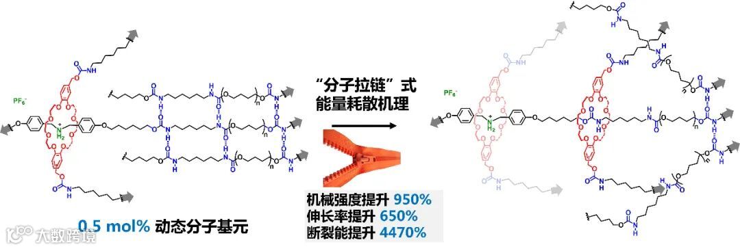 高性能弹性体因其在柔性电子、人工致动器和刺激响应材料等新兴领域的应用前景而受到广泛关注。然而,在提高聚合物网络的机械强度和拉伸性能方面总是存在权衡。比如用弱牺牲键取代部分强共价交联可以提高拉伸性能,但同时也会降低机械强度。最近,由于机械键化学的兴起,将机械互锁分子作为滑环交联剂引入聚合物网络以提高聚合物性能的策略得到了关注。然而,现有的例子只提高了材料的拉伸性能,但在力学强度方面存在一定的局限性。