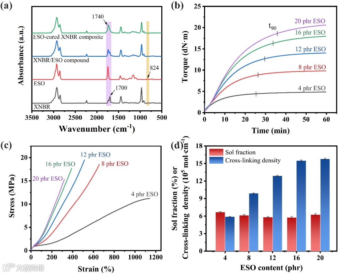 图4. (a) XNBR、ESO、未固化XNBR/ESO和固化的XNBR/ESO的红外光谱图;不同ESO用量的XNBR/CB橡胶复合材料的 (b) 硫化曲线;(c) 应力-应变曲线;(d) 交联密度