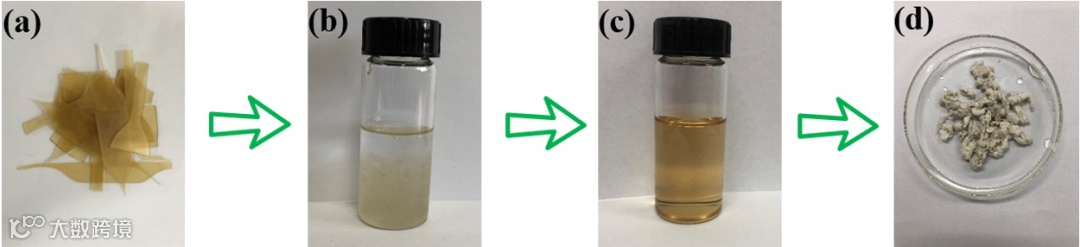 图6. 化学回收过程:(a) 原始的废橡胶;(b) 溶胀后;(c) 酯基水解后;(d) 絮凝后