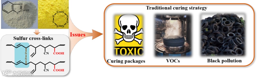橡胶具有独特的高弹性,在国民经济和国防等领域中有着不可取代的作用。橡胶的交联(硫化)是其获得高弹性的前提,只有经过交联的橡胶才具有实用价值。但是,目前橡胶工业广泛使用的交联方法(主要为硫磺交联和过氧化物交联)存在以下几个难以避免的固有问题:(1) 交联体系中会包含有毒的物质,比如常用的促进剂TMTD会产生致癌物亚硝胺等;(2) 交联加工过程会释放有毒且难闻的“硫化烟气”——粉尘和挥发性有机物(VOCs),比如CS2、胺类有机物等,这不仅会对人的健康造成极大的危害,还是橡胶制品难闻气味的重要来源;(3) 废弃的橡胶制品回收再利用十分困难,带来严重的“黑色污染”。因此,为橡胶材料开发新型的绿色交联方法具有重要的意义。