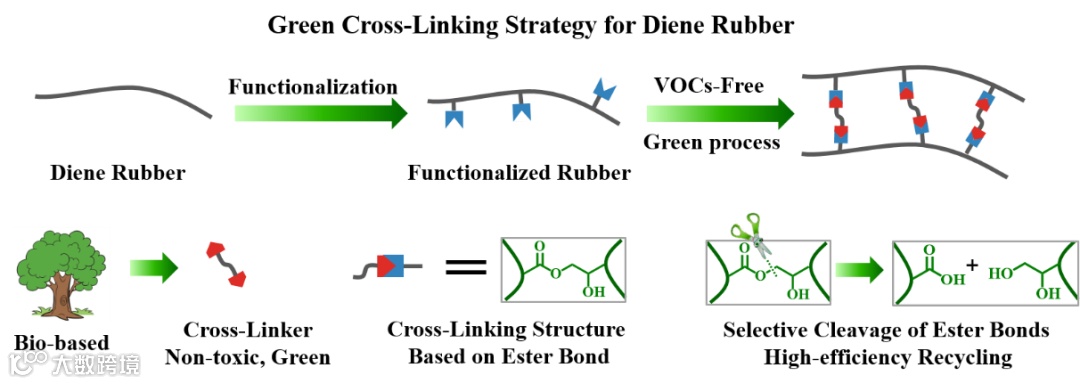 针对橡胶传统硫化方法存在的上述问题,北京化工大学张立群教授和华南理工大学郭宝春教授合作在国际上提出了橡胶材料“绿色交联”的概念以及设计策略。该研究团队基于环氧基团与羧基之间简单有效的化学反应,提出以易于工业化制备的环氧官能化或羧基官能化橡胶作为基体,以生物基有机分子如生物基二羧酸或生物基环氧大豆油作为绿色交联剂替代硫磺和过氧化物,构建“酯基”交联网络结构。该新型绿色交联方法可以使橡胶材料实现绿色且高效的交联;同时能够兼具焦烧安全性和交联效率,还能有利于废橡胶高效回收再利用(图2)。相关研究成果对橡胶工业的绿色化具有变革性的意义,也为官能化橡胶的应用提供新的机遇。