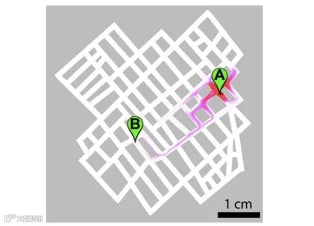 看,在迷宫出口和入口放上特定的化学材料,入口的颜料就可以自动找到走出迷宫的最短路径——