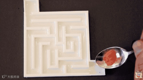2012年,中国科学院化学研究所的研究者们也利用马拉糕泥榴,做了一个硬核吃豆人。把这个固态水晶吃豆人放在迷宫入口,它就能自动找到出口——