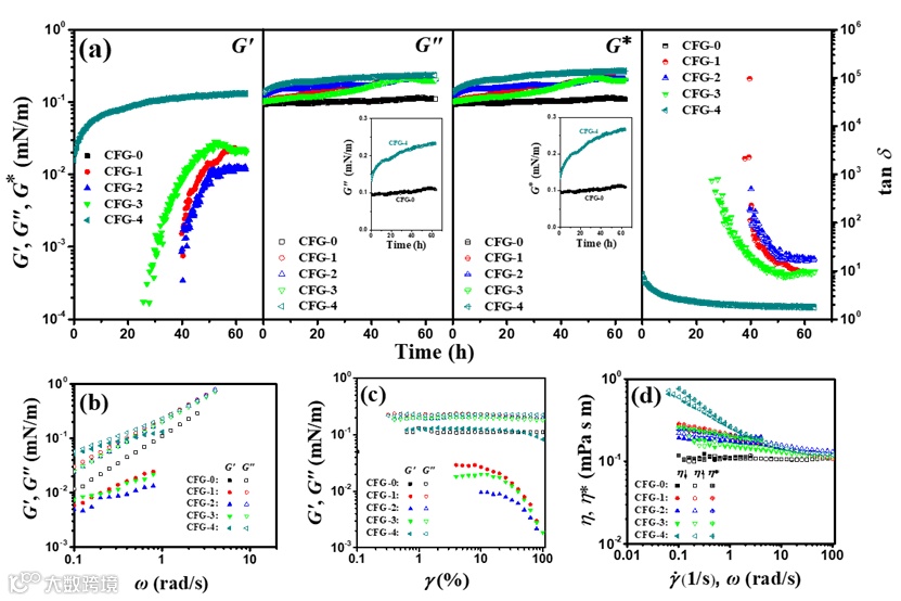 图2. 天然CFG和酯化CFG稳定的大豆油-水界面的(a)界面剪切模量G'、G''、G*和tanδ随时间的变化(图中的插图对比了未改性CFG和改性CFG-4稳定的界面膜的G''和G*随时间的变化);b)界面动态频率扫描;(c)界面动态应变扫描和(d)界面剪切黏度随剪切速率下降(实心符号)和上升(空心符号)的变化和复数黏度(中心+符号)的对比。(图中各样品酯化度依次为:CFG-0, 0; CFG-1, 0.3%; CFG-2, 2.4%: CFG-3, 3.4%; CFG-4, 6.1%)