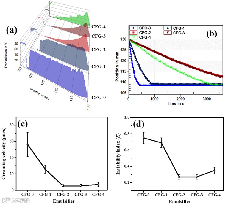 图5. 天然CFG和酯化CFG稳定的5%大豆油乳液的透过率演化图(a)、乳化动力学(b)、乳液分层速率(c)和不稳定指数(d)。