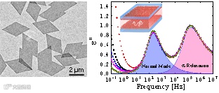 不同于第一个工作采用近似球形的分子颗粒,第二个工作中作者通过自晶种(self-seeding)的方法生长了结晶-非晶双嵌段共聚物(PLLA -b-PBO)的片层单晶。该类嵌段聚合物单晶的特点:形状(菱形)、大小(微米级)和厚度(纳米级)均一(如图2所示);其单晶表面接枝链PBO的长度和接枝密度均一,并可通过嵌段聚合物的组成进行控制,而这些特性与片层单晶在聚合物基体中的分散状态直接关联。实验证明聚合物片层单晶随体积分数的增加可形成有序的胶体液晶相,如平行排列的盘状向列相。有别于第一个工作,接枝于单晶表面的高分子链与高分子基体的化学组成相同(同为PBO),以此构成无热复合体系。作者研究了该类具有可控界面的片层单晶形成的中性壁对高分子链的限域效应。含不同片层单晶体积分数的复合体系的介电实验表明,高分子链的均方末端距,高分子链和链段的运动即使在较强的限域作用下依然与本体行为保持一致,表现出高分子熔体的本征属性。