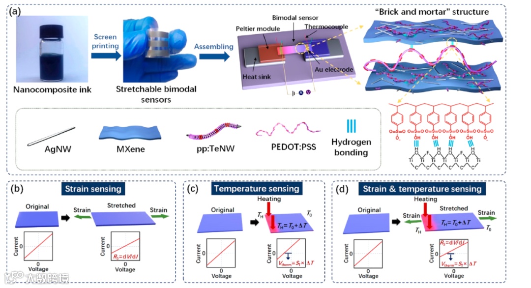 图1(a) 可拉伸MXene-AgNW-PEDOT:PSS-pp:TeNW双参数传感器的制作工艺和结构示意图。在(b)施加应变,(c)施加温度梯度,以及(d)同时施加应变和温度刺激时,传感器的解耦传感机制示意图。