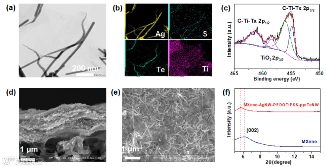 图2(a)MXene-AgNW-PEDOT:PSS-pp:TeNW纳米复合油墨的TEM图像(b)纳米复合油墨中元素Ag、S、Te和Ti的相应EDS图谱。(c) MXene在Ti2p区的XPS谱(d) 打印MXene-AgNW-PEDOT:PSS-pp:TeNW纳米复合薄膜的横截面SEM图像和(e)平面SEM图像(f) 纯MXene和MXene-AgNW-PEDOT:PSS-pp:TeNW的XRD图谱。