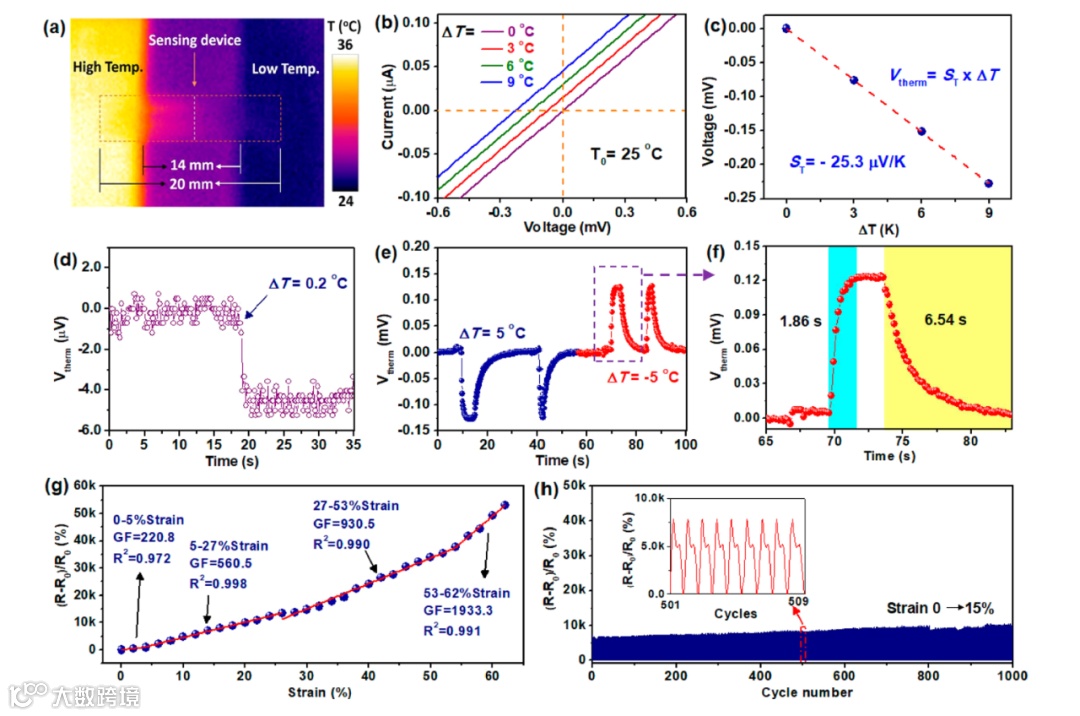 图3 MXene-AgNW-PEDOT:PSS-pp:TeNW双参数传感器的热传感和应变传感性能:(a) 红外热成像显示了一个传感薄膜的温度分布,其中一端加热,另一端由两个分离的帕尔贴元件冷却。温度梯度为9℃。(b)在不同ΔT下测量的传感膜的I−V曲线。(c)测量输出电压作为传感器薄膜ΔT的函数(d)在ΔT为0.2°C时,未拉伸状态下传感膜的输出电压。(e) 在加热和冷却循环下测量传感膜的响应时间。(f)一个加热-冷却循环的放大图:加热-冷却循环的响应时间(青色)和加热-冷却循环的松弛时间(黄色)。(g)测量系数和传感装置的线性行为。(h) 在0-15%应变范围内,1000次拉伸和释放循环后,传感器的相对电阻变化。