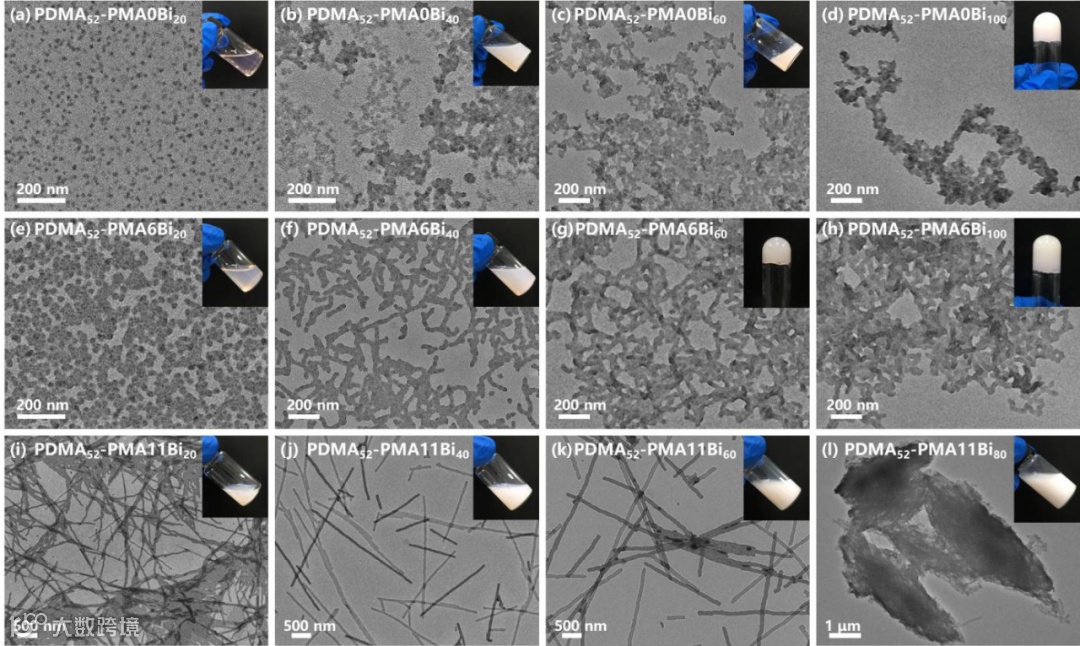 研究结果表明,对于PDMA-PMA0Bi体系(主链与液晶基元间无柔性间隔基),当形核段聚合度较低时,样品呈相对澄清的分散液状态,约20 nm的聚合物球可在TEM下观察到;随着聚合度增加,分散液粘度提高,此时一部分球发生融合形成不规则的聚集体;继续增加聚合度,不规则的聚集体继续融合并发生了物理缠结使分散液流动性变差,最终形成了自支撑的凝胶,如图2a-d。对于PDMA-PMA6Bi体系(主链与液晶基元间柔性间隔基较短),随着形核段聚合度增加,样品宏观状态与PDMA-PMA0Bi体系类似,由相对澄清的分散液转变为牛奶状分散液,最终转变为自支撑凝胶。纳米粒子形貌由球状转变为分散的蠕虫状,最终形成缠结的蠕虫,如图2e-h。对于PDMA-PMA11Bi体系(主链与液晶基元间柔性间隔基较长),在形核段聚合度为20-60时,纳米粒子呈一维线状,随着聚合度增加,纳米线逐渐长粗变直,形成直径分别为~55 nm和~95 nm的纳米棒;继续增加聚合度,纳米棒间发生团聚,形成微米级的聚集体。PDMA-PMA11Bi体系样品始终为牛奶状的分散液状态,并未形成凝胶,如图2i-l。
