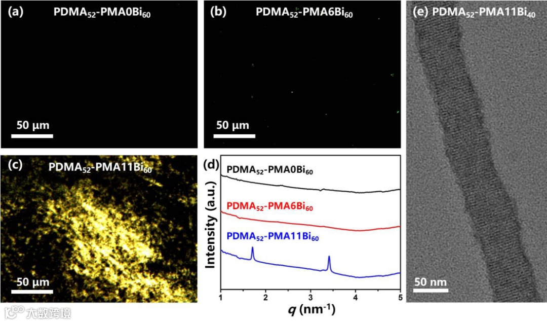 进一步地,通过POM、SAXS、TEM等对纳米粒子内部结构进行研究,发现没有柔性间隔基时(PDMA-PMA0Bi体系),液晶基元与主链间偶合作用较强,纳米粒子内部无法形成有序排布的液晶结构;柔性间隔基较短时(PDMA-PMA6Bi体系),液晶基元的流动性虽有改善,但在PISA条件下依然无法形成有序的内部结构;柔性间隔基较长时(PDMA-PMA11Bi体系),纳米粒子内部可以形成规整的层状近晶结构,如图3。