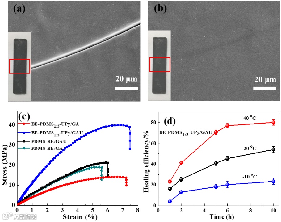 图3. BE-PDMS1:3-UPy/GAU复合材料的微观形貌、力学性能和自修复性能。(a,b)BE-PDMS1:3-UPy/GAU自修复前后的断裂界面的SEM照片。(c)BBE-PDMS1:3-UPy/GAU、BE-PDMS1:3-UPy/GA、PDMS-BE/GAU和PDMS-BE/GA复合材料的应力-应变曲线。(d)BE-PDMS1:3-UPy/GAU、BE-PDMS1:3-UPy/GA和PDMS-BE/GAU在-10、20和40 ℃温度下处理1-10 h的拉伸强度恢复率。