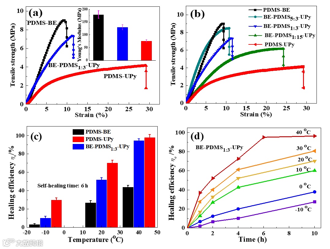 图2. BE-PDMS-UPy的力学性能和自修复性能。(a)PDMS-BE、PDMS-UPy和BE-PDMS1:3-UPy的应力-应变曲线以及相应的杨氏模量(插图)。(b)含不同比例的BE和UPy的BE-PDMS-UPy应力-应变曲线。(c)在不同温度下处理6 h后BE-PDMS-UPy拉伸强度恢复率。(d)BE-PDMS1:3-UPy在-10-40 ℃温度范围内处理不同时间后的拉伸强度恢复率。