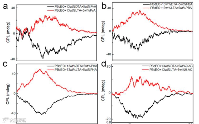 图3 不同发光分子在嵌段共聚物组装体系的CPL发光特性