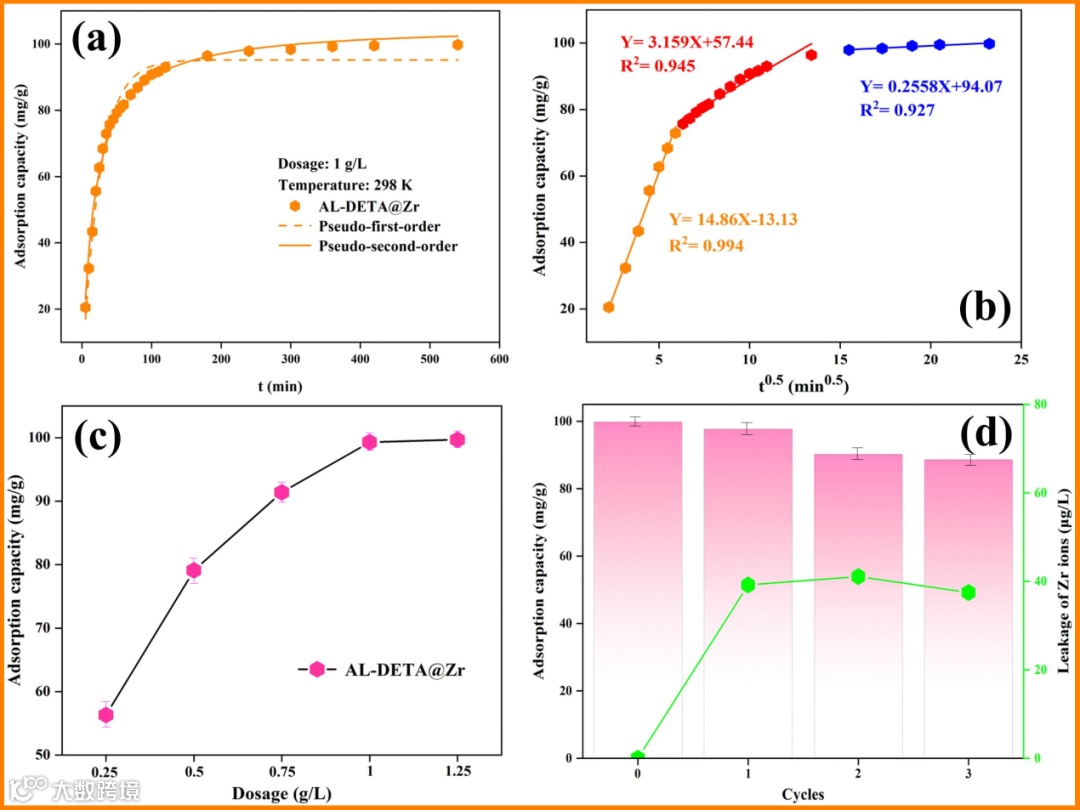图2 (a, b) AL-DETA@Zr的吸附动力学研究;(c) 吸附剂量对于AL-DETA@Zr吸附能力的影响;(d) AL-DETA@Zr的循环性研究