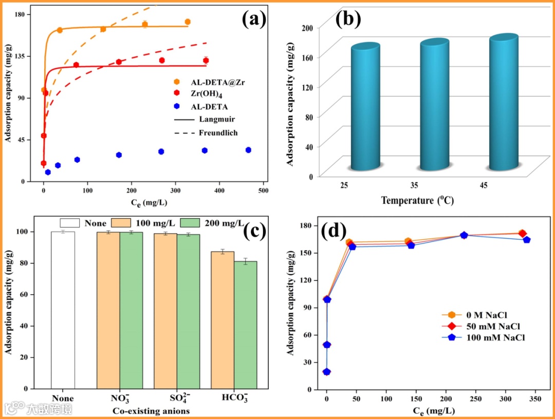 图3 (a) 几种材料的吸附等温线研究;(b) 温度对于AL-DETA@Zr吸附能力的影响;(c) 几种共存阴离子对于AL-DETA@Zr吸附磷酸根的影响;(d) 离子强度对于AL-DETA@Zr吸附能力的影响