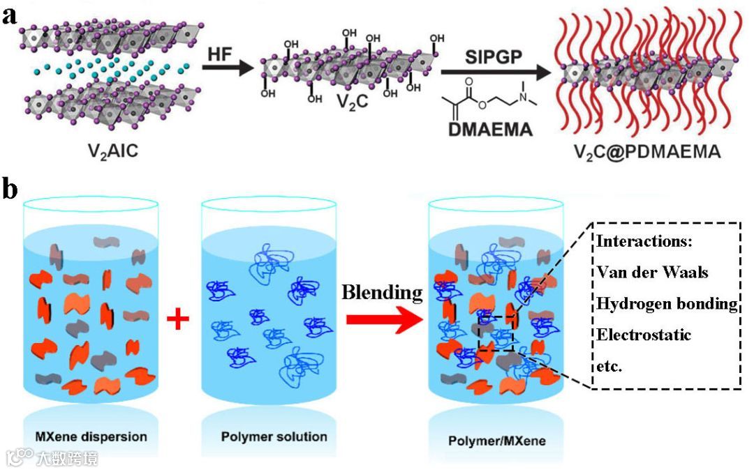 图2. MXene与聚合物间的共价键(a)和非共价键(b)作用。