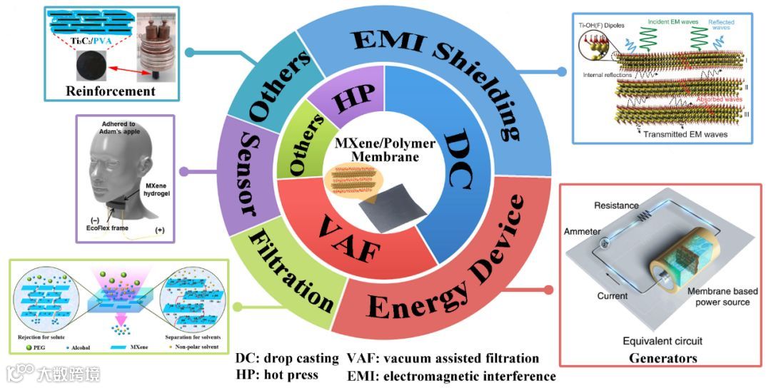 图1. MXene/聚合物薄膜的制备及其应用总结:饼图的大小代表了制备方法和实际应用的相关论文占总发表论文的比重。