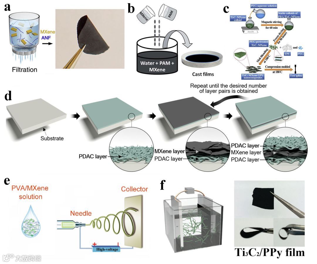 图3. MXene/聚合物薄膜的制备方法:真空辅助抽滤(a)、溶液浇膜(b)、热压成膜(c)、层层自组装(d)、静电纺丝(e)以及电化学沉积(f)。