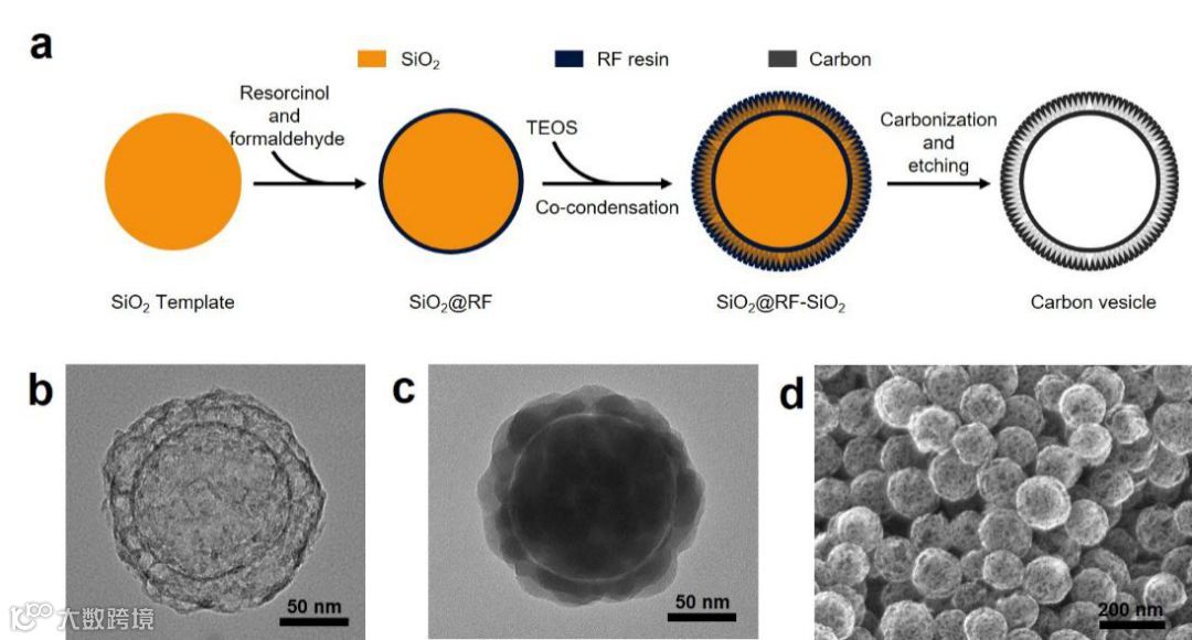 图1. 碳囊泡结构:(a)制备过程示意图;(b)TEM照片;(c)碳囊泡所用SiO2模板反结构的TEM照片;(d)SEM照片。