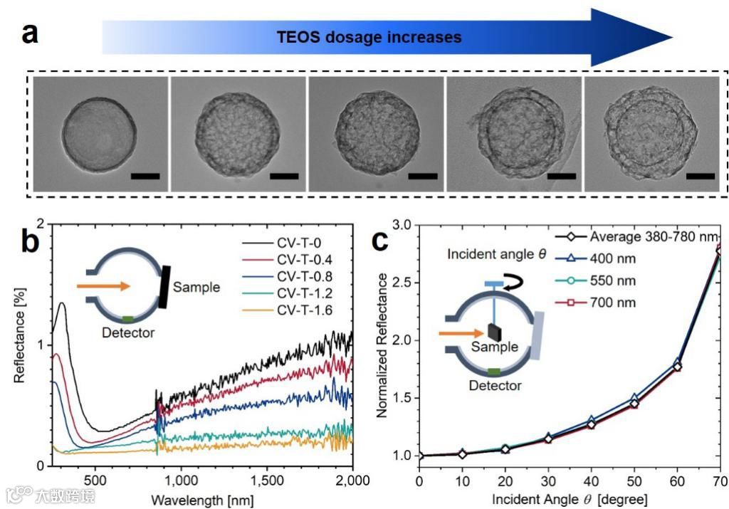 图2. (a)碳囊泡结构随TEOS加入量的增加形貌发生变化;(b)不同TEOS用量条件下,碳囊泡结构的半球光谱反射率;(c)不同波长条件下,碳囊泡结构反射率随入射角的变化情况。