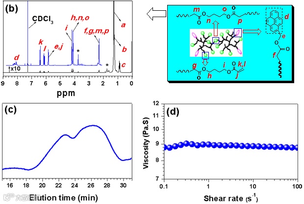 图2. HBPE@Py@Acryl的合成及结构表征: (a) 合成过程; (b)1H NMR谱图; (c) GPC曲线;(d)剪切粘度随剪切速率变化曲线.