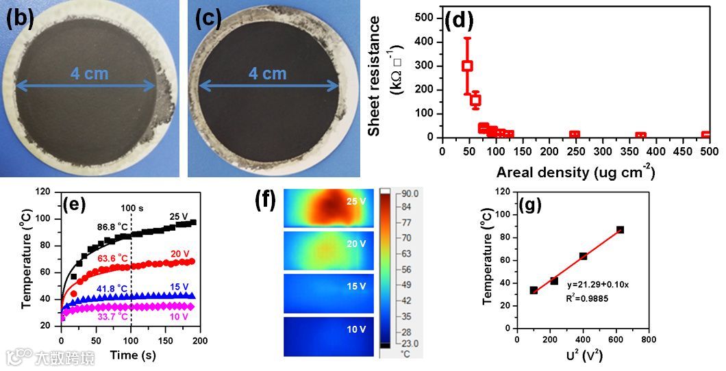 从所得石墨烯分散液出发,经抽滤和UV辐照(45 °C, 5 min),可获得以PTFE膜为支撑的石墨烯柔性电热涂层(图4a),其外观致密均匀(图4b,c)。当石墨烯面密度达124 μg cm-2,即可形成完善的导电网络(图4d)。在较低的驱动电压如25 V,所得涂层在不到50 s内可升温至90 °C,同时通过电压改变,可实现稳态温度有效调控(图4e,f),电热转化效率近100%(图4g)。这表明所得石墨烯涂层具有优异的电热性能,可满足可穿戴功能器件等场合使用要求。